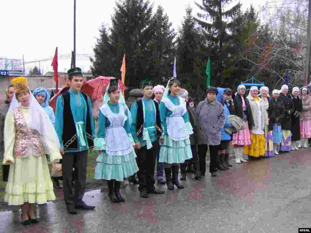 Кунакларны милли киемле кызлар ипи, тоз, чәкчәк һәм кымыз белән каршы алды.