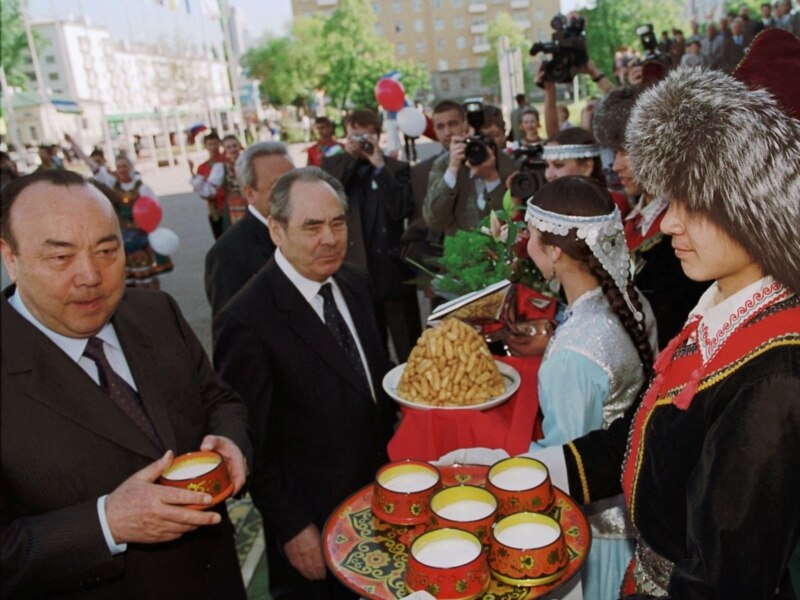Мортаза Рәхимов һәм Миңтимер Шәймиев Бөтендөнья башкортлары корылтаенда, Уфа, 14 июнь 2002