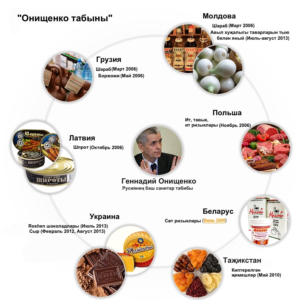 2000нче еллар уртасыннан башлап Роспотребнадзор бик күп азык-төлекне тыйды. Кайвакыт бу тыюлар ике-өч атна гына, ул азыкны сатучы ил белән Русия арасындагы сәяси яки икътисади бәхәс чишелгәнчегә кадәр генә дәвам итте. Ә кайвакыт, мәсәлән Польша очрагында, бу тыю бик озакка сузылып Русиянең Европа Берлеге белән мөнәсәбәтләрендә дә чагыла башлады. Онищенко тыйган бу азыклардан бик яхшы табын әзерләп булыр иде. Азатлык Радиосы сезнең игътибарга шул тыелган азыклардан "әзерләнгән" табын тәкъдим итә.