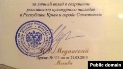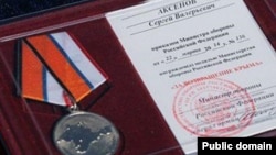 Русия Кырымны аннексияләгән соң бик ашыгыч рәвештә медаль дә сукты. Саклану министрлыгыныкы ул. Медаль 22 мартта расланды һәм беренче нөсхәләрен 24 март көнне тапшырдылар да инде. Русия саклану министры Сергей Шойгу медальне Кырымны аннексияләүдә катнашкан "Беркут" хәрбиләре, диңгез пехотачылары, флот җитәкчелеге белән бергә Кырымның үзешчән хөкүмәте башлыгы Сергей Аксеновка да такты.