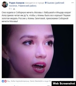 "Алинә дәү әнисе белән Мәскәү Җәмигъ мәчетендә булды. Мәскәү мөфтие Илдар хәзрәт Аляутдинов Алинәгә дога кылды. Русиянең беренче алтын медале Мәскәү Җәмигъ мәчетенә йөрүче – Алинәдә", дип язды.