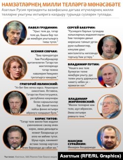 Русия президентын сайлауда кемгә тавыш бирергә дип икеләнүчеләр өчен намзәтләрнең кайбер мөһим мәсьәләләргә карашларын чагылдырган кыскача белешмә әзерләдек. Игътибарга аларның милли телләргә мөнәсәбәте, төбәкләр вәкаләтләре, тышкы сәясәт, Кырым һәм мәгариф турында фикерләре алынды. (Тулырак мәгълүмат)