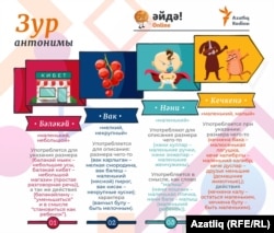 - Стилистическим антонимом к слову “зур” можно отнести и слово “бәләкәй”, который на русский язык переводится как “маленький, небольшой”. Это больше разговорный вариант. Антоним, в большинстве случаев употребляется для указания размера (бәләкәй мыек – небольшие усы, бәләкәй кәбестә – маленькая капуста), а так же действия (бәләкәйләнү – “уменьшаться” и в смысле “становиться как ребенок”).