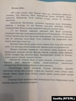 Бераз гына башкорт түрәләре тоттырган текстка күз салыйк. Текстта “450 елдан элегрәк җиде башкорт ыруы рус патшасына мөрәҗәгать иткәннәр, шул вакыттан бирле Башкортстан Русия составына ныклы кушылган”, диелә. Монда татар аңына, имеш, инде 450 ел элек үк Башкортстан дигән дәүләт(?) булган дип сеңдерелә. Бу чеп-чи ялган. 450 елдан элегрәк, Казан ханлыгы урыслар тарафыннан басып алынганчы, бүген “Башкортстан” дип аталган төбәкнең территориясе өч татар дәүләтенә – Казан, Себер ханлыкларына һәм Ногай урдасына кергән була. Башкортлар шушы татар дәүләтләрнең җирендә яшәүче дистәләгән халыкларның берсе генә була. Янә: “Башкортлар Наполеонны, чуалышлы чорларның ялган патшаларын җиңәләр”, дип раслана язмада. Менә бит нинди көчле халык икән бу башкортлар, дип тагын да тирәнрәк ихтирам хисенә бирелергә кирәктер инде. Җиңүдә катнашалар түгел – җиңәләр!
