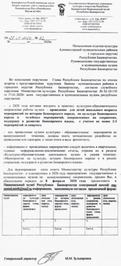 Кыскача гына әйткәндә, Башкортстан республикасының милли музее муниципаль районнарның мәдәният бүлекләренә һәм район музейларына чирек елга ике-өч тапкыр (ягъни айга бер) башкорт телен, тарихын һәм мәдәниятен алга сөрү чаралары уздырырга фәрман биргән. Андый фәрман барлык муниципаль музейларга да җибәрелгән. Ул чараларны фото һәм видеога төшереп “югарыга” хисап бирү дә мәҗбүри.