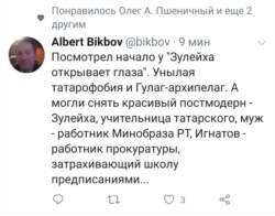 Блогер Альберт Бикбов болай дип яза: "Зөләйха күзләрен ача"ның башын карадым. Моңсу татарофобия һәм Гулаг-архипелаг. Ә шундый матур фильм төшерә алырлар иде – Зөләйха татар теле укытучысы, аның ире – Татарстан мәгариф министрлыгы хезмәткәре, Игнатов – мәктәпләрне кисәтүләр җибәреп гарык итүче прокуратура вәкиле.