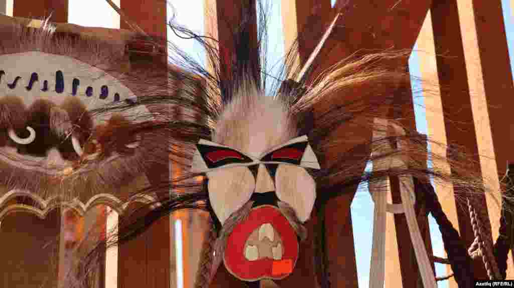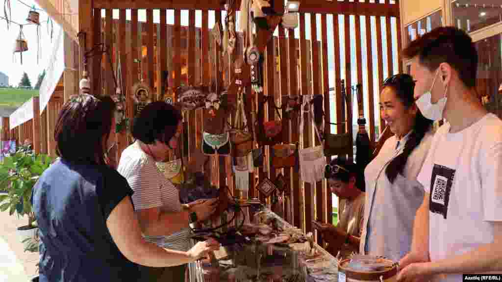 Игенчеләр сарае каршындагы күргәзмәгә керү юлында якут милли киемендәге егетләр-кызлар каршы ала