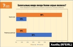 Балаларыгызның нинди телдә белем алуын телисез, дигән сорауга җаваплар да кызыклы. Татарча да, урысча да тигез дәрәҗәдә дип әйтүче татарлар саны 62 процент булса, шундый ук җавап бирүче урыслар 18 процент булды. 80 урыслар һәм 18 процент татарлар баласының урысча гына укуын тели.
