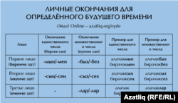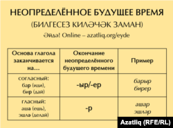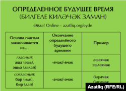 Окончания определенной формы: -ачак/-әчәк, -ячак/-ячәк, которые используются в зависимости от последней буквы основы. Напомним, что основой глагола является глагол в повелительном наклонении.