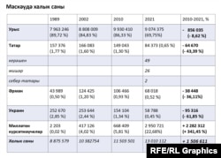 Иң күп кимү украиннар һәм татарларда теркәлгән. Ун елда украиннар 95 мең кешегә кимегән (-61,85%). Татарлар 149 043тән 84 373кә калган. Бу 2010 елгы җанисәп белән чагыштырганда 43 процентка азрак, ягъни 64 670 татар "юкка чыккан". Моннан тыш, 49 кеше керәшен, 26 кеше мишәр, 2 кеше себертатар булып язылган. Әрмәннәр дә шактыйга - 38 мең кешегә (-36,11%) азайган.