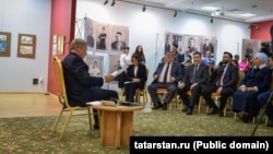 26 апрель, Туган тел көне уңаеннан, Татарстан президенты Рөстәм Миңнеханов татар иҗат әһелләре белән очрашты. Казан Кирмәнендәге күргәзмәләр залында узган утырышта нигездә берничә көн алдан килештерелгән сораулар бирелде. Шулай да аралашу барышында сценарийда язылмаган мәсьәләләр дә күтәрелде. Миңнеханов үз чиратында барлык сорауларга сакчыл җавап кайтарырга тырышты һәм ни сәбәпледер үз фикерләрен җиткергәндә микрофонсыз сөйләүне хуп күрде.