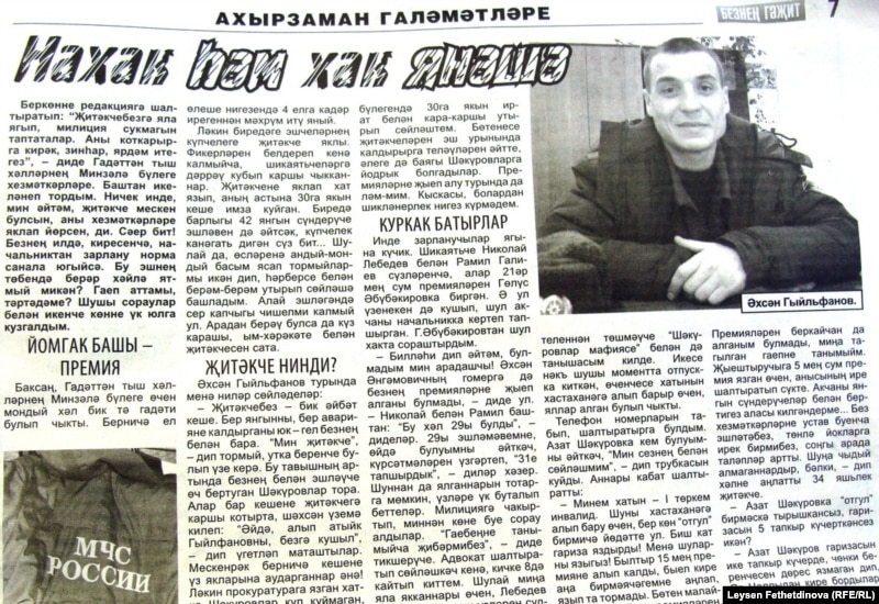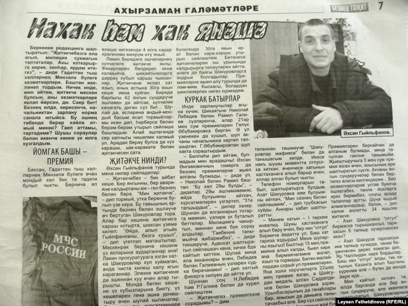 Лилия Заһидуллина “Нахак һәм хак янәшә” дип исемләнгән язмасында үткәргән тикшеренүе турында яза. Ул гадәттән тыш хәлләр министрлыгының Минзәлә бүлеге җитәкчесе Әхсән Гыйлфановка нахак яла ягулары, аңа каршы эш алып барылуы турында хәбәр итә.